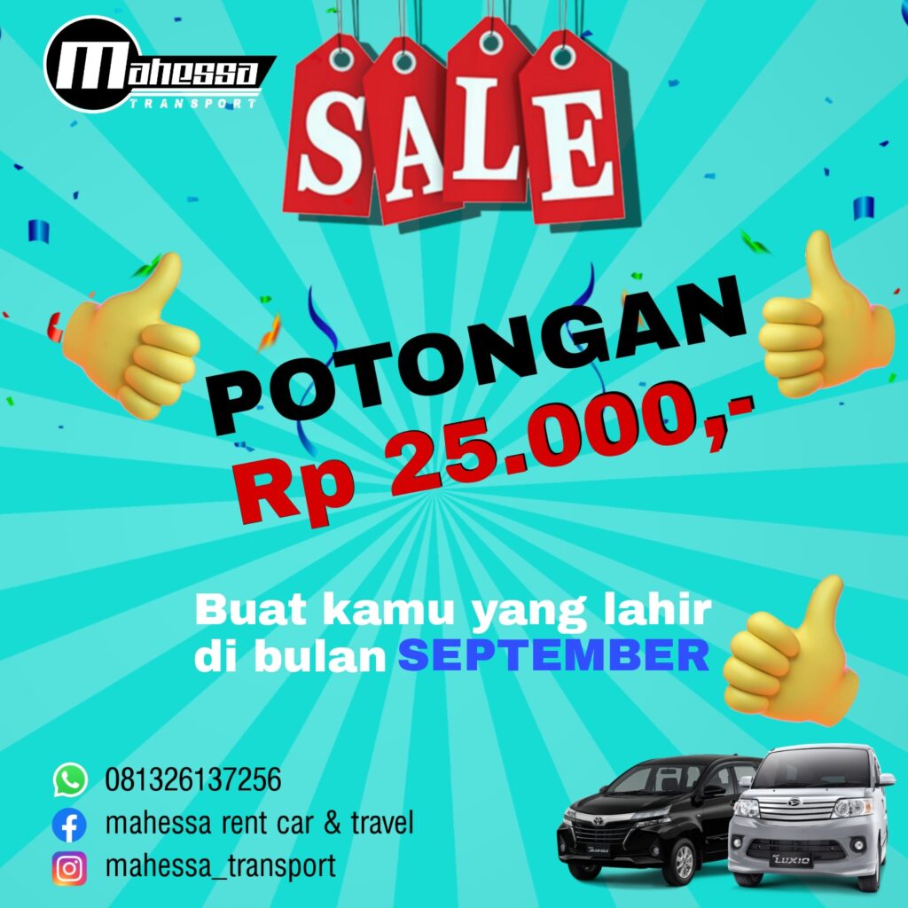 Mimin punya hadiah buat kalian yang lahir di bulan September!! Bagi kalian yang mau naik travel atau carter dari Mahessa Trans bisa dapatkan potongan Rp 25.000 periode bulan September.
